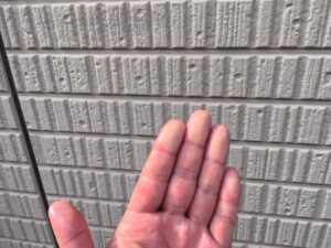 外壁を手で触ったときに白い粉がつく現象を「チョーキング」といいます。塗料に含まれる顔料が紫外線によって分解され、表面に粉状になって現れたものです。防水機能がすでに低下しているサインであり、早めの対応が必要です。